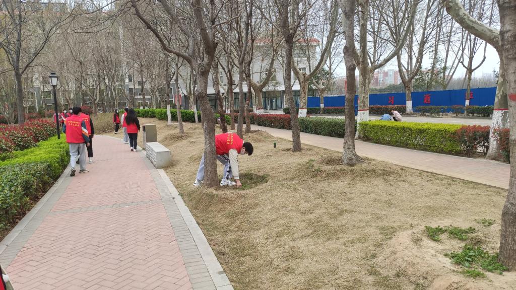 活动开始前志愿者们统一戴好口罩做好疫情防护,活动进行中志愿者身穿红色马甲,有组织有纪律的在明湖广场和教学楼分组分区。在各个死角清理落叶、清理校园内乱张贴小广告、白色垃圾等。