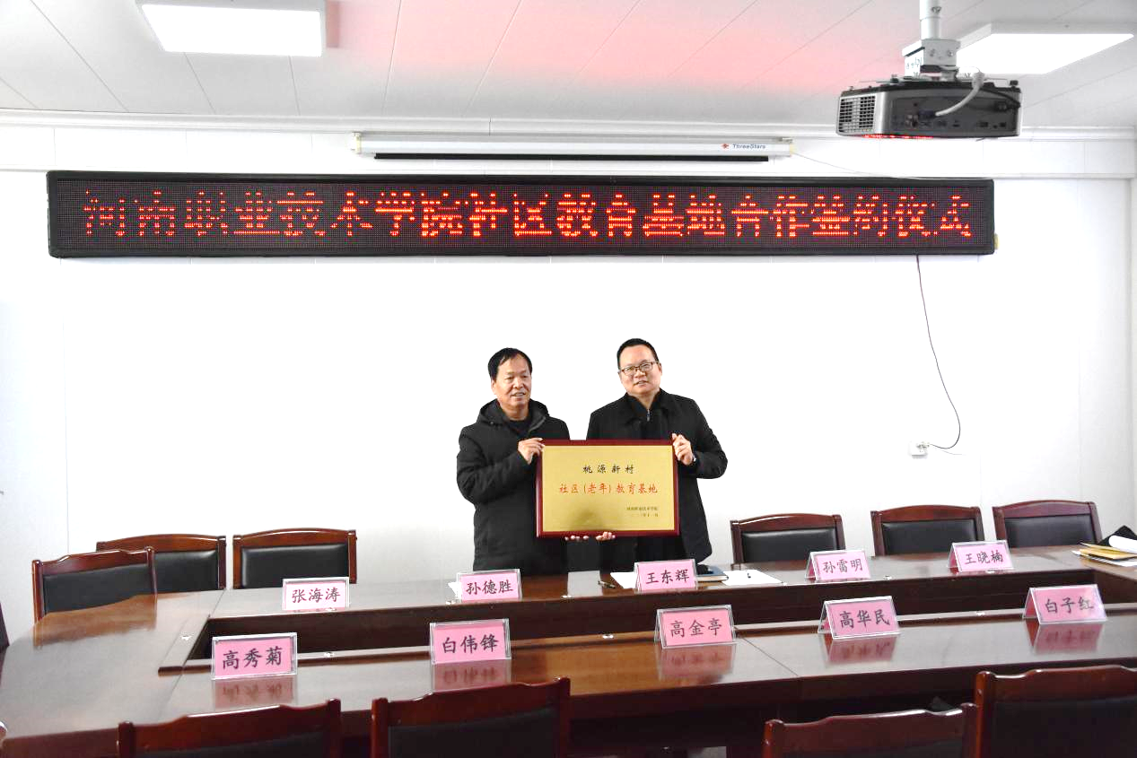 12月22日上午,k1体育与新郑市辛店镇北靳楼村桃源新村社区的社区(老年)教育基地合作签约及授牌仪式在桃源新村社区顺利举行。电子与物联网公司党总支书记王东辉、桃源新村党总支书记高金亭、相关教师代表和社区居民代表参加了仪式。